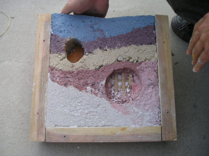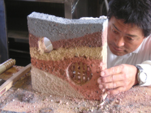 型枠の中に、色や配合の違う左官材を順番に詰めていって、文字通り「地層」のようなインテリアオブジェを作ろうというものです。