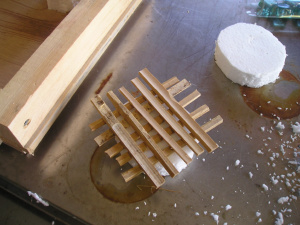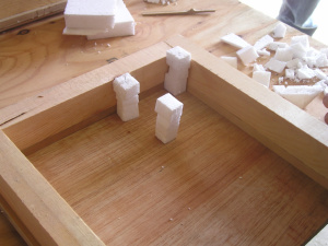 割り竹で作った小舞の模型を発砲スチロールで挟みます。