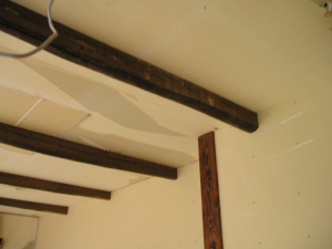 さて、以前に手に入れた足場丸太。3方を挽いてこんな形で天井のサオ(化粧でつける梁)になりました。オイルによる着色は施主のロロさんの仕事。