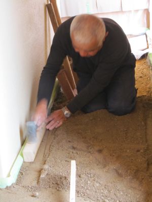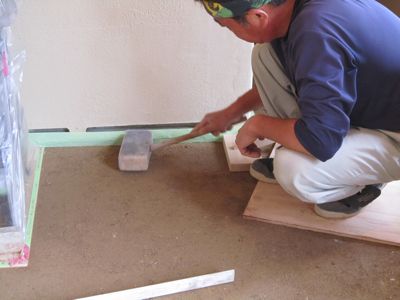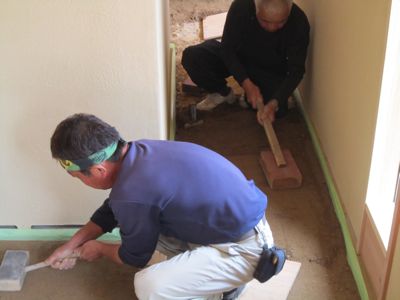 サバ土に苦汁と石灰を混ぜて撹拌したものを叩いて土間を仕上げてゆきます。