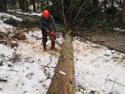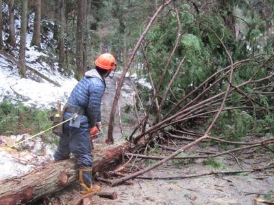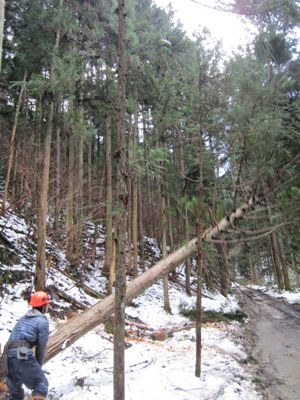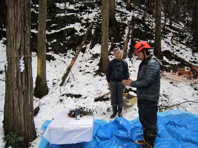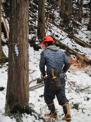 先日、施主さんといっしょに太い柱になる木を伐りに行きました。