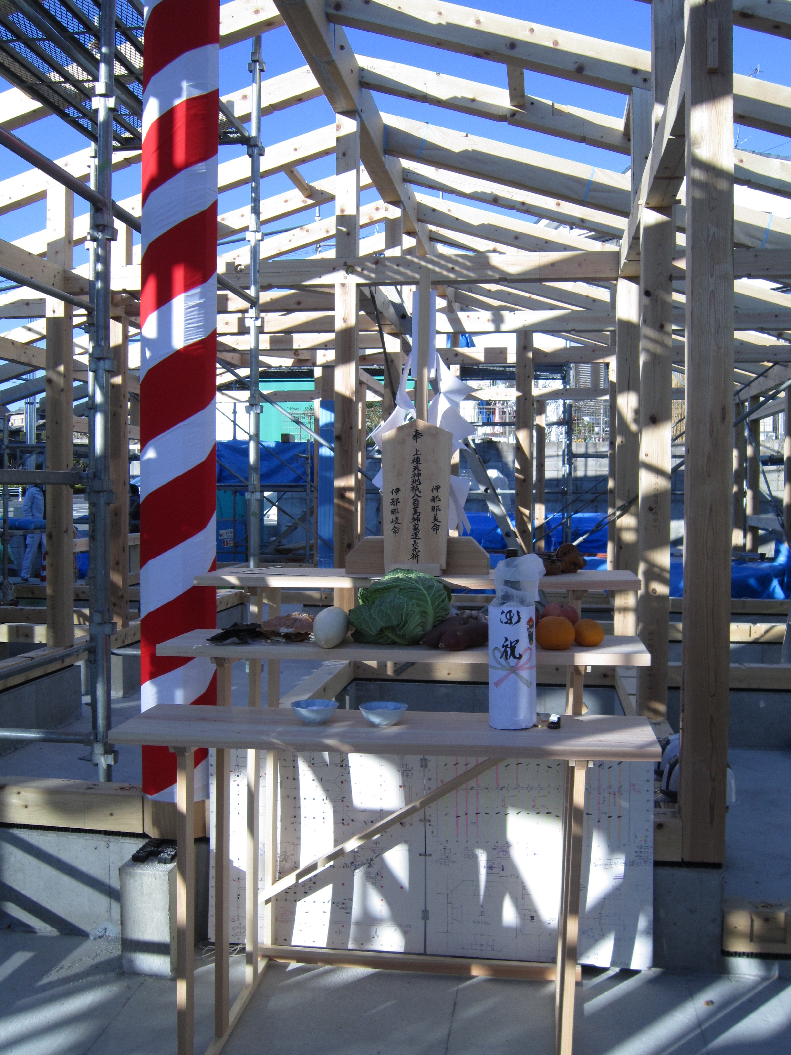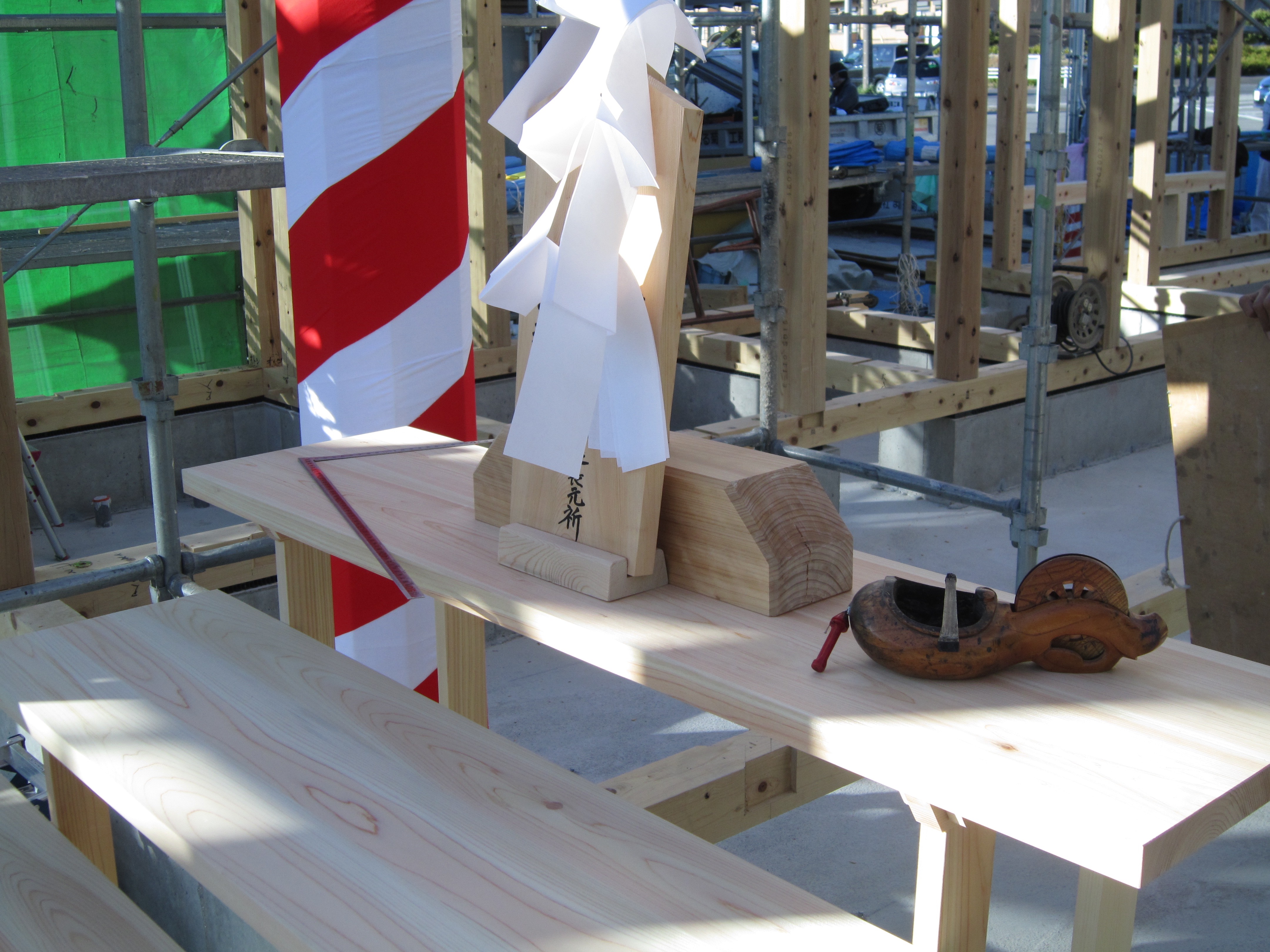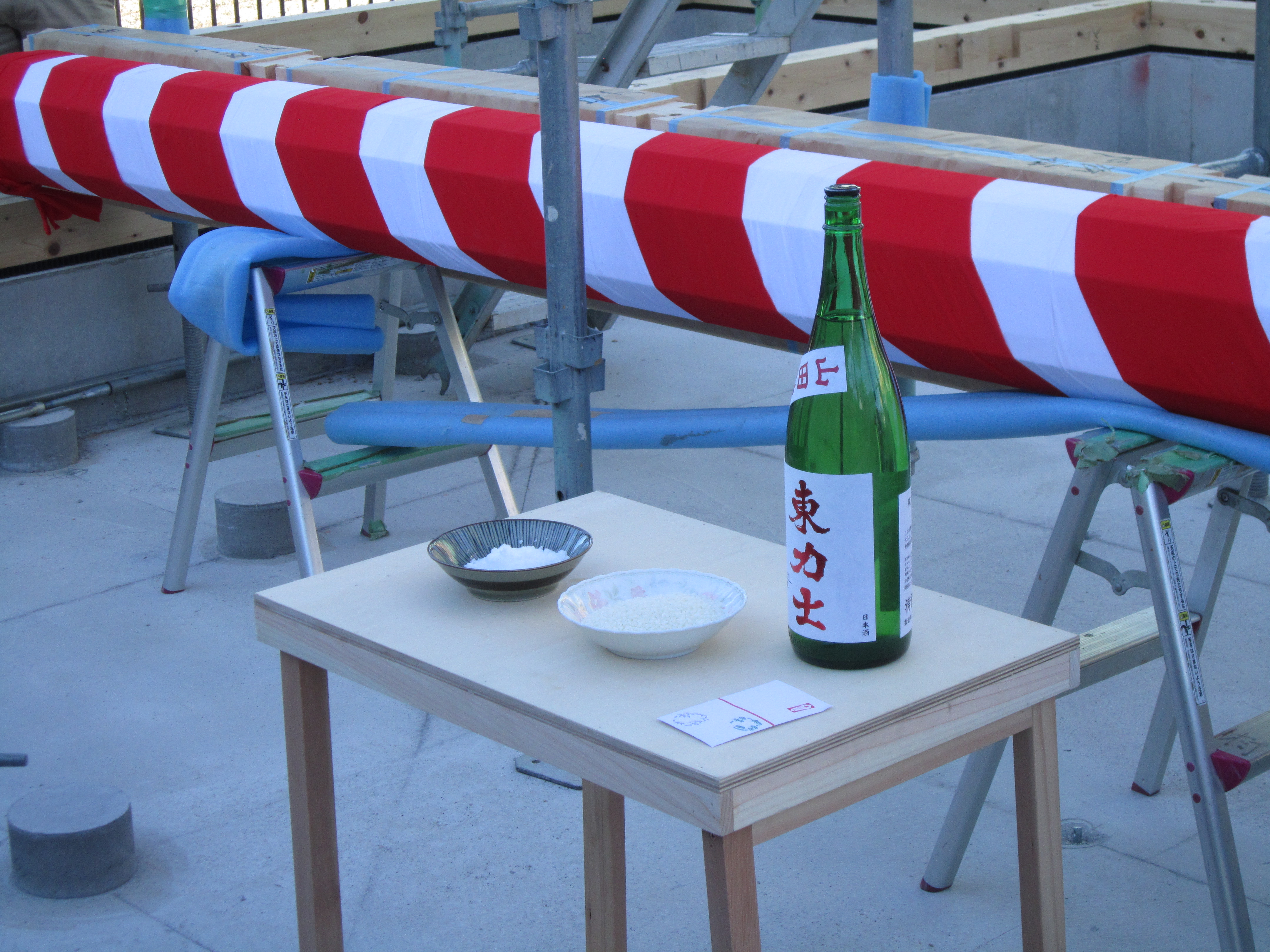 道具を並べて祭壇をつくり、棟梁が祝詞をあげて、その後施主さんと一緒に建ち上がった家の四隅に塩と御神酒をまいて回る。というものでした。
