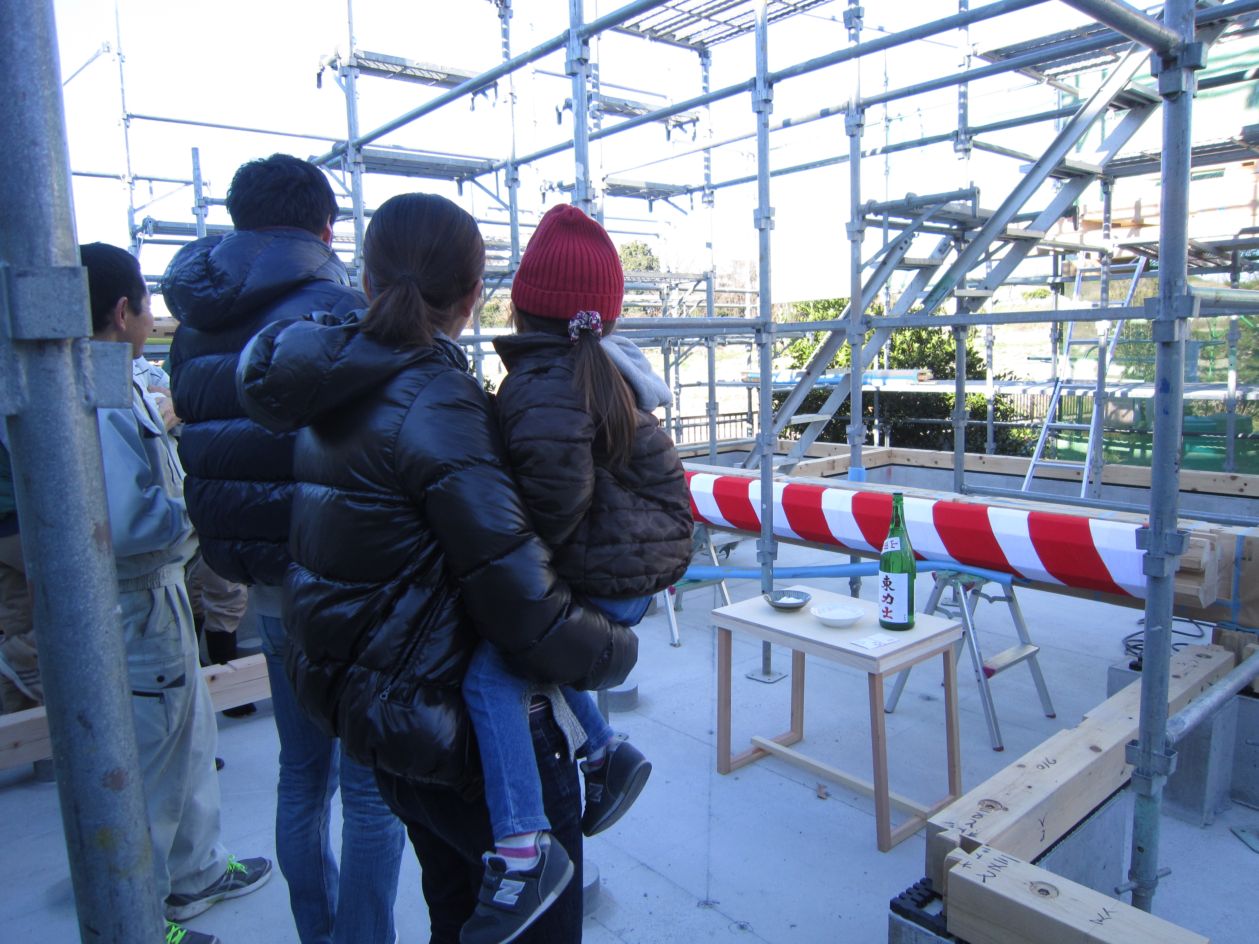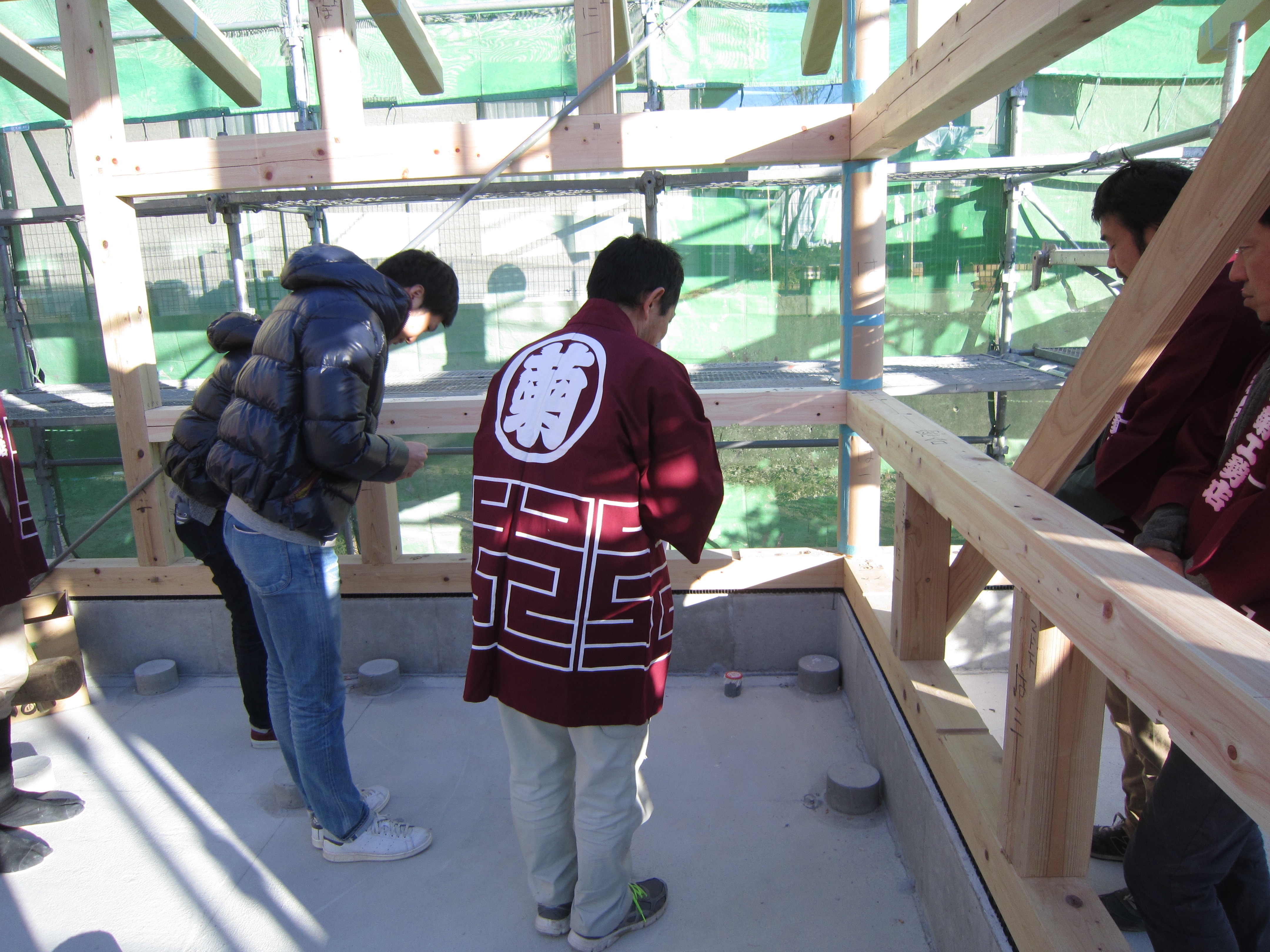 上棟の朝、最初の柱を立てるお祝いの式です。