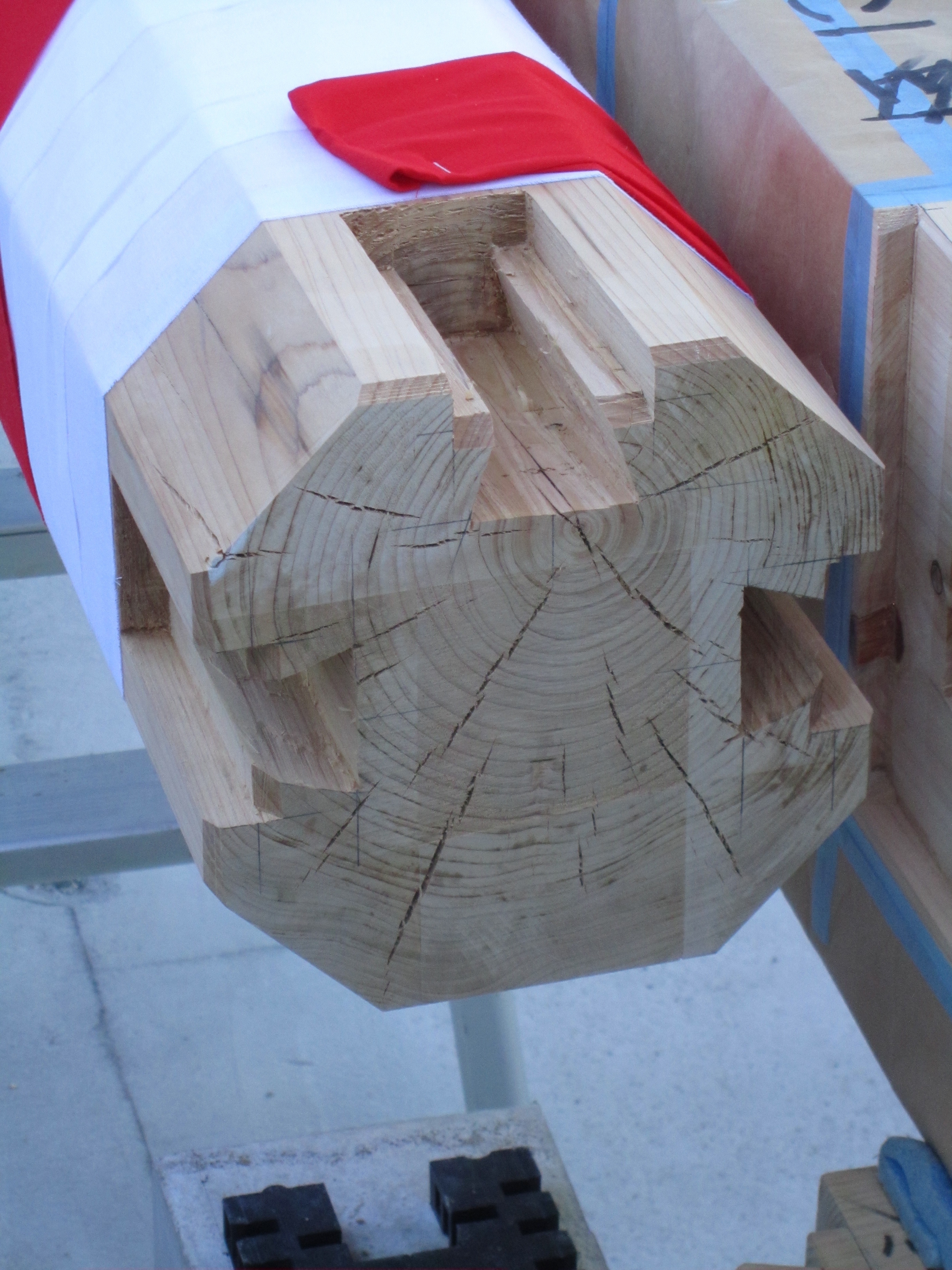 これは、屋根の登り梁が掛かる部分の仕口「渡り顎」