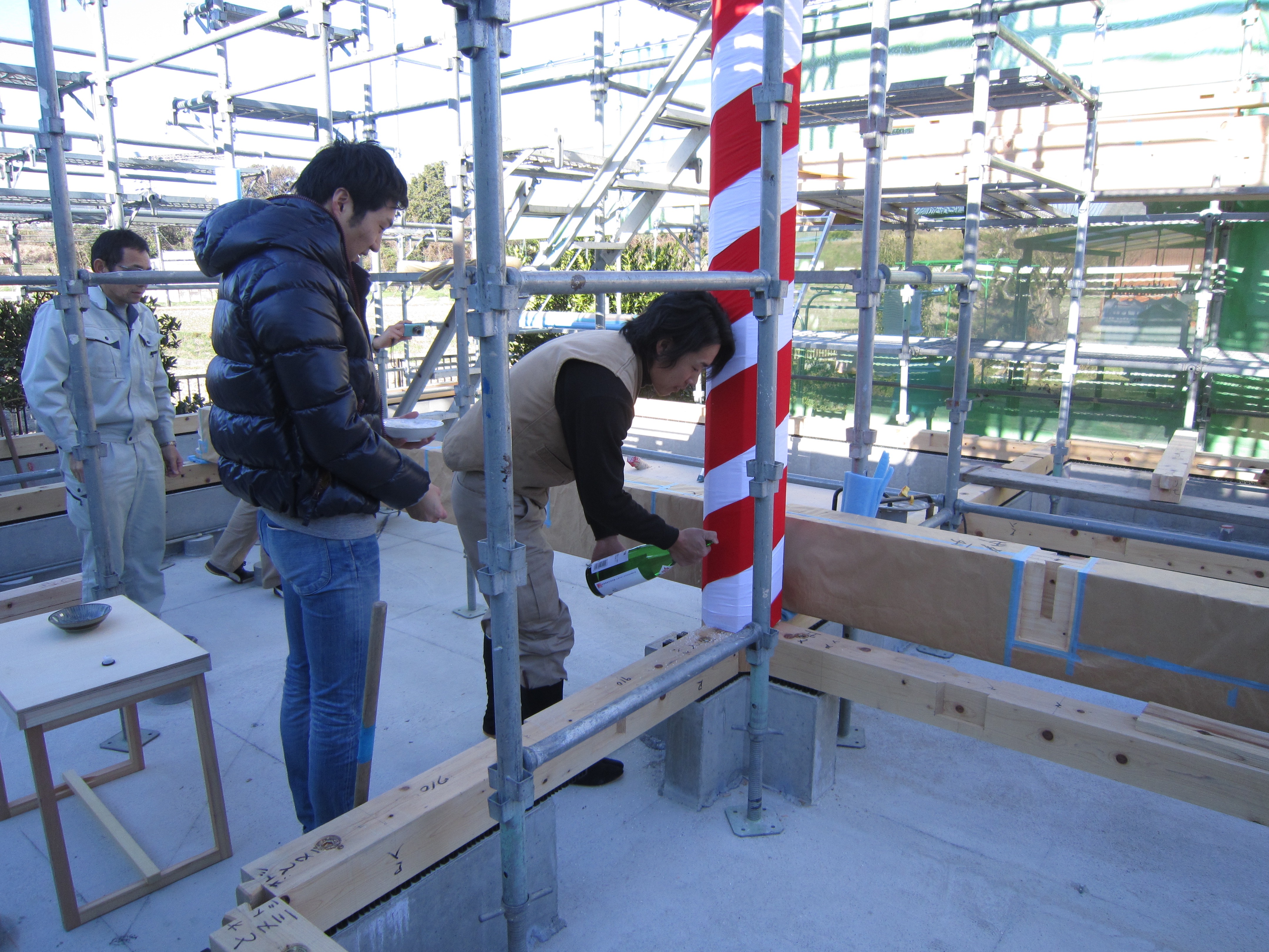 ・・・が、施主さんは初めてすることですから、太い柱はなかなか入っていきません。