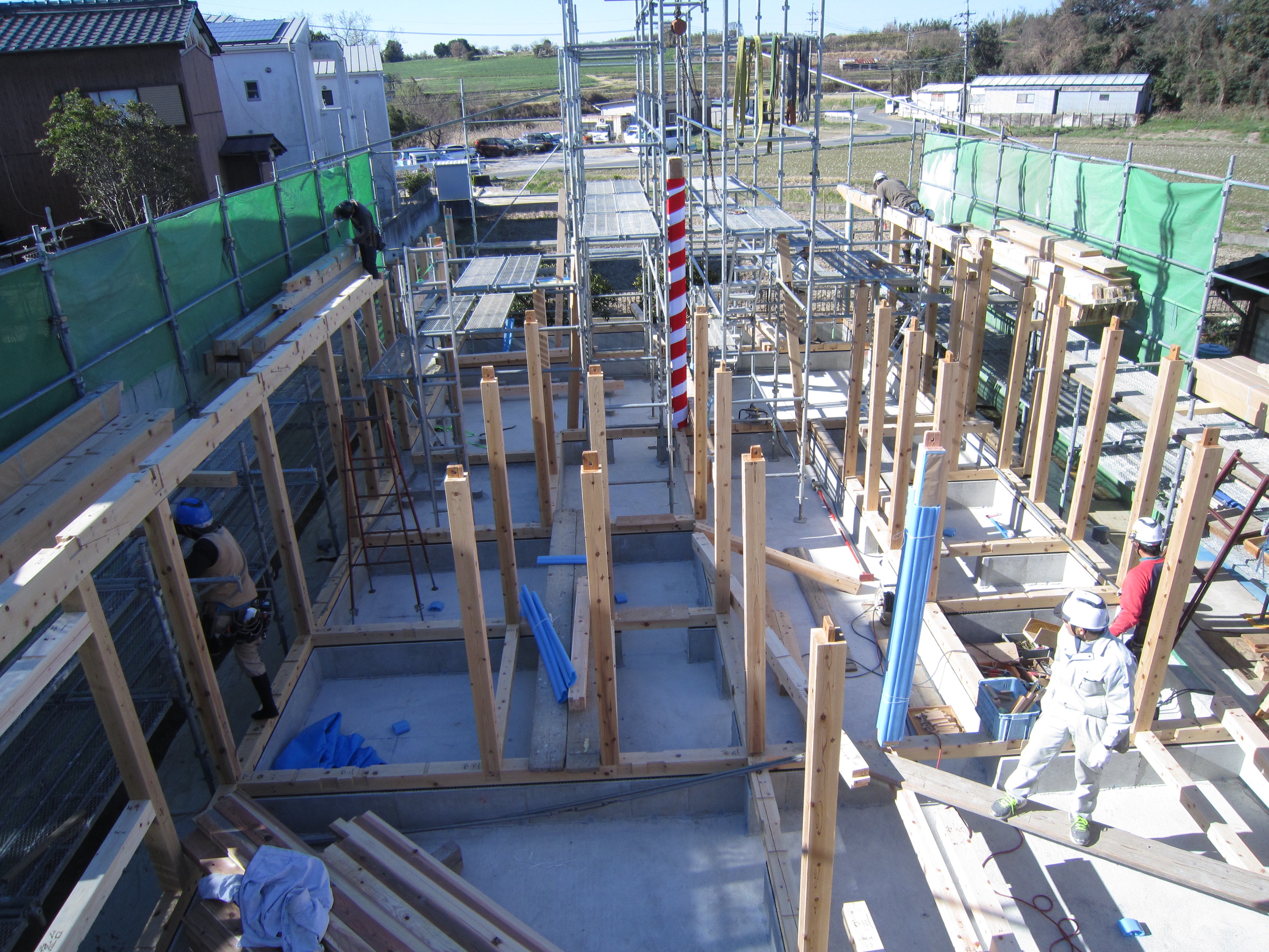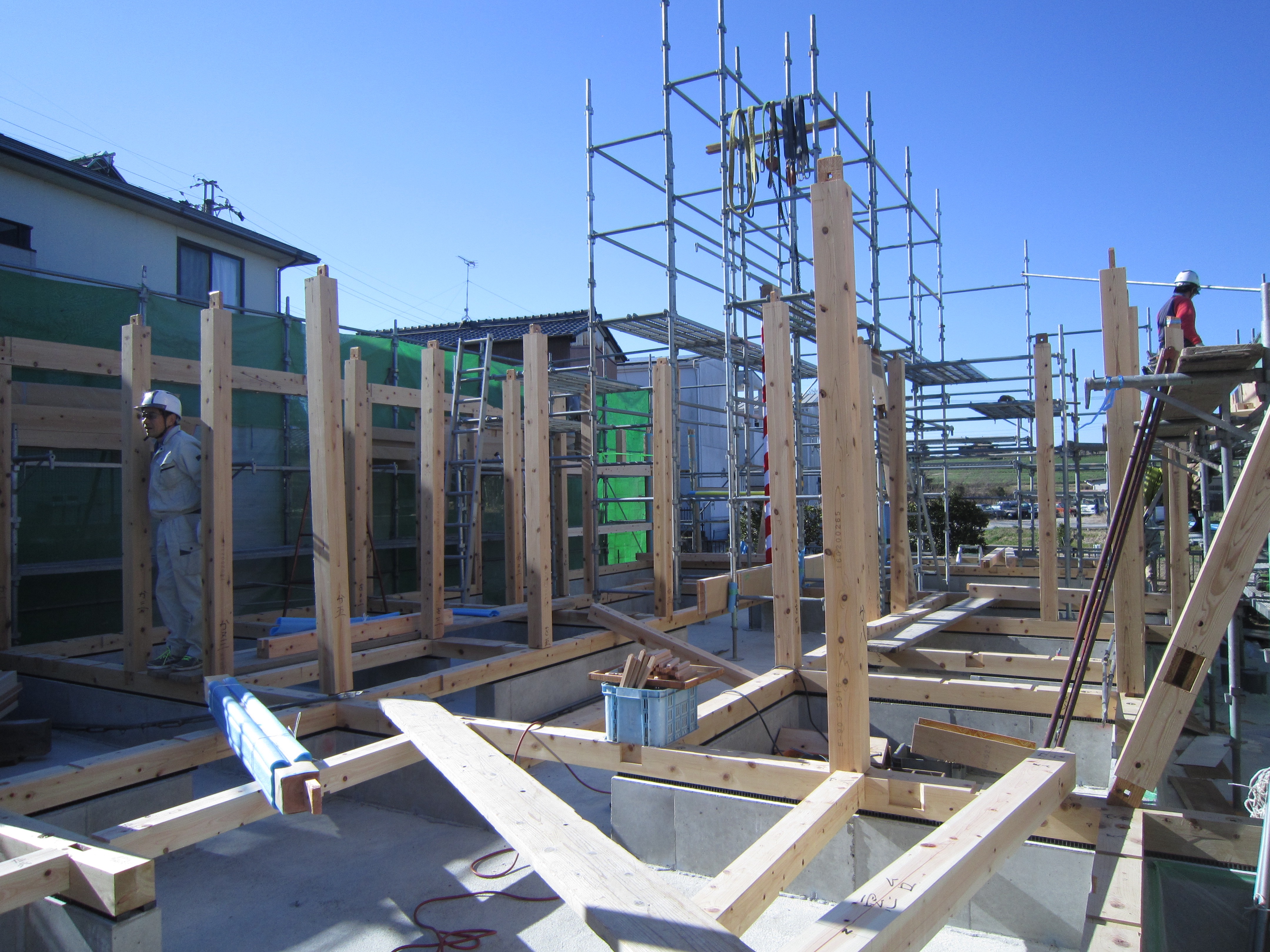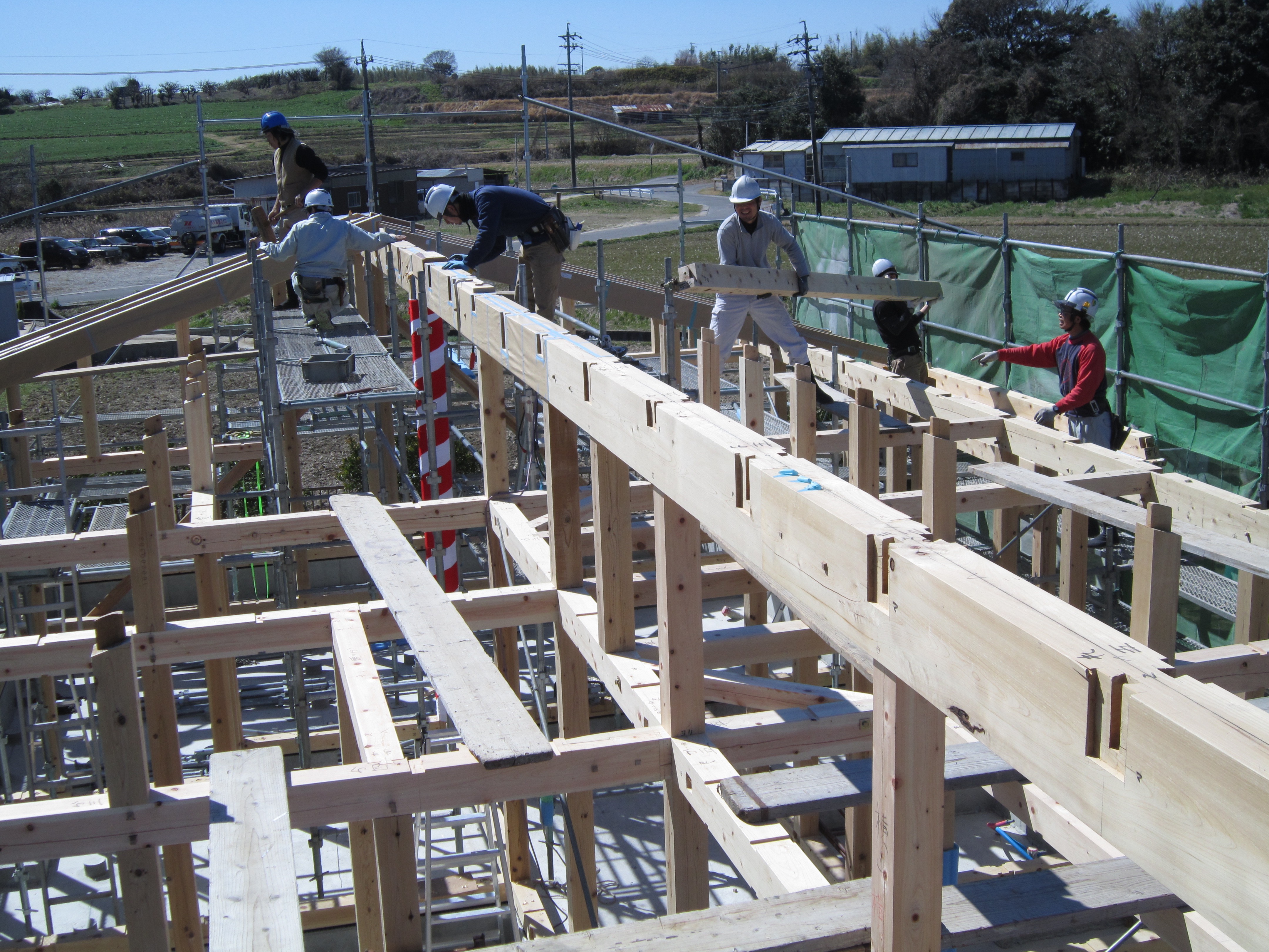 さて、その後次々に柱が立てられ、大工さんたちのテキパキした動きでどんどん骨組みができてゆきます。