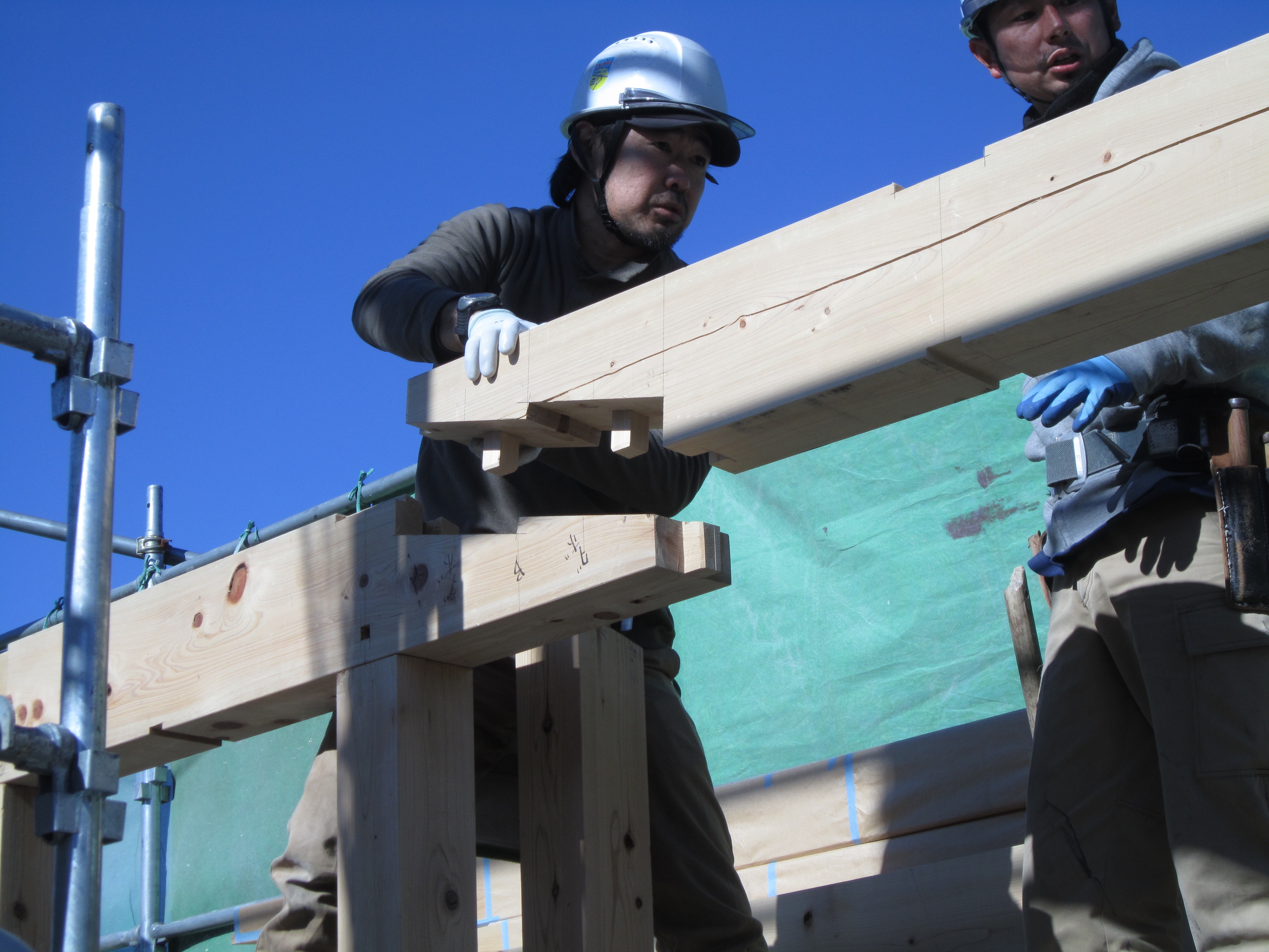 棟木も上がり、屋根の登り梁を納めてゆきます。
