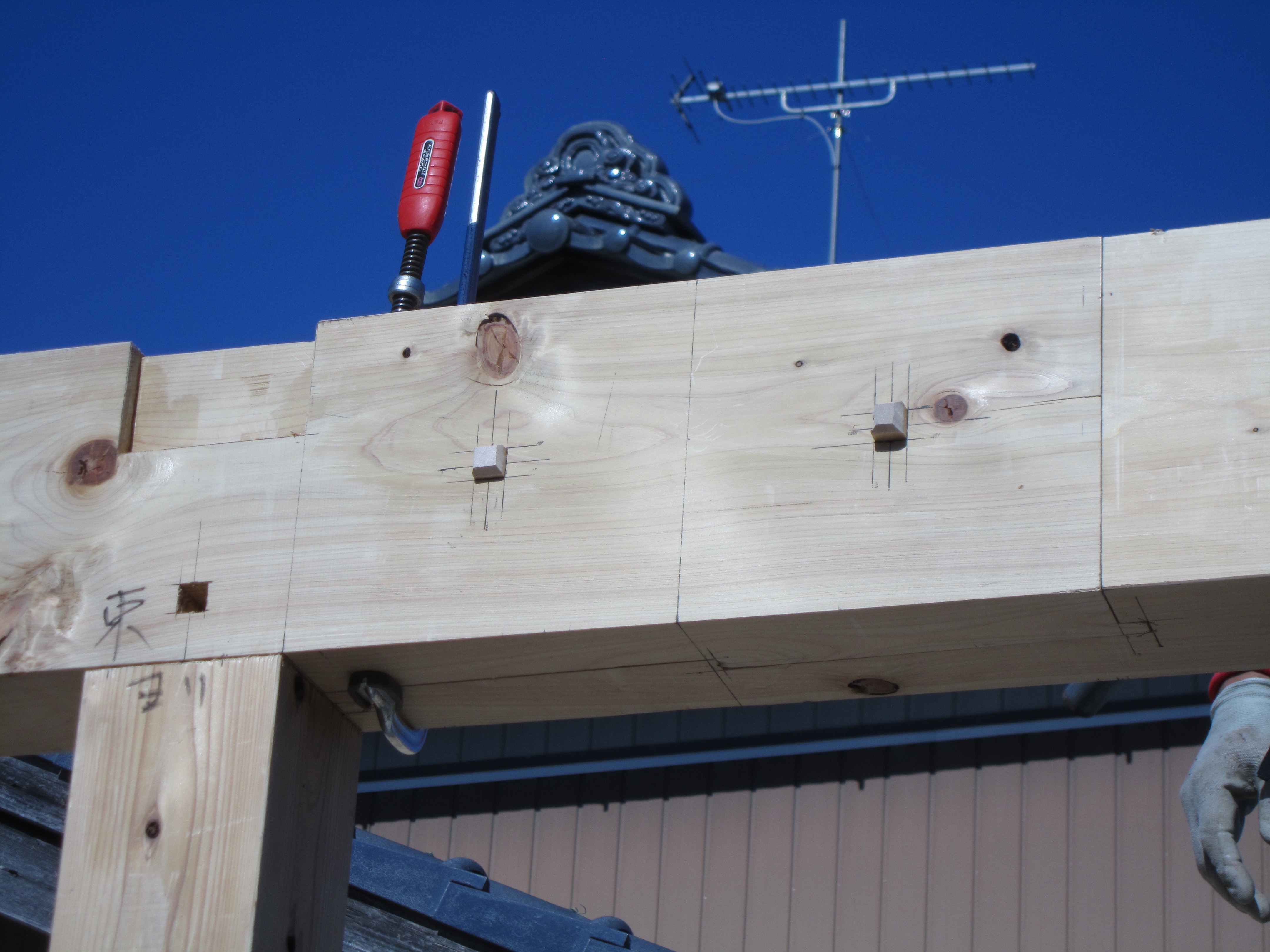 窓など開口部の上の強度を上げる「まぐさ組み」とその端部の仕口「ホゾ抜き込栓打ち」