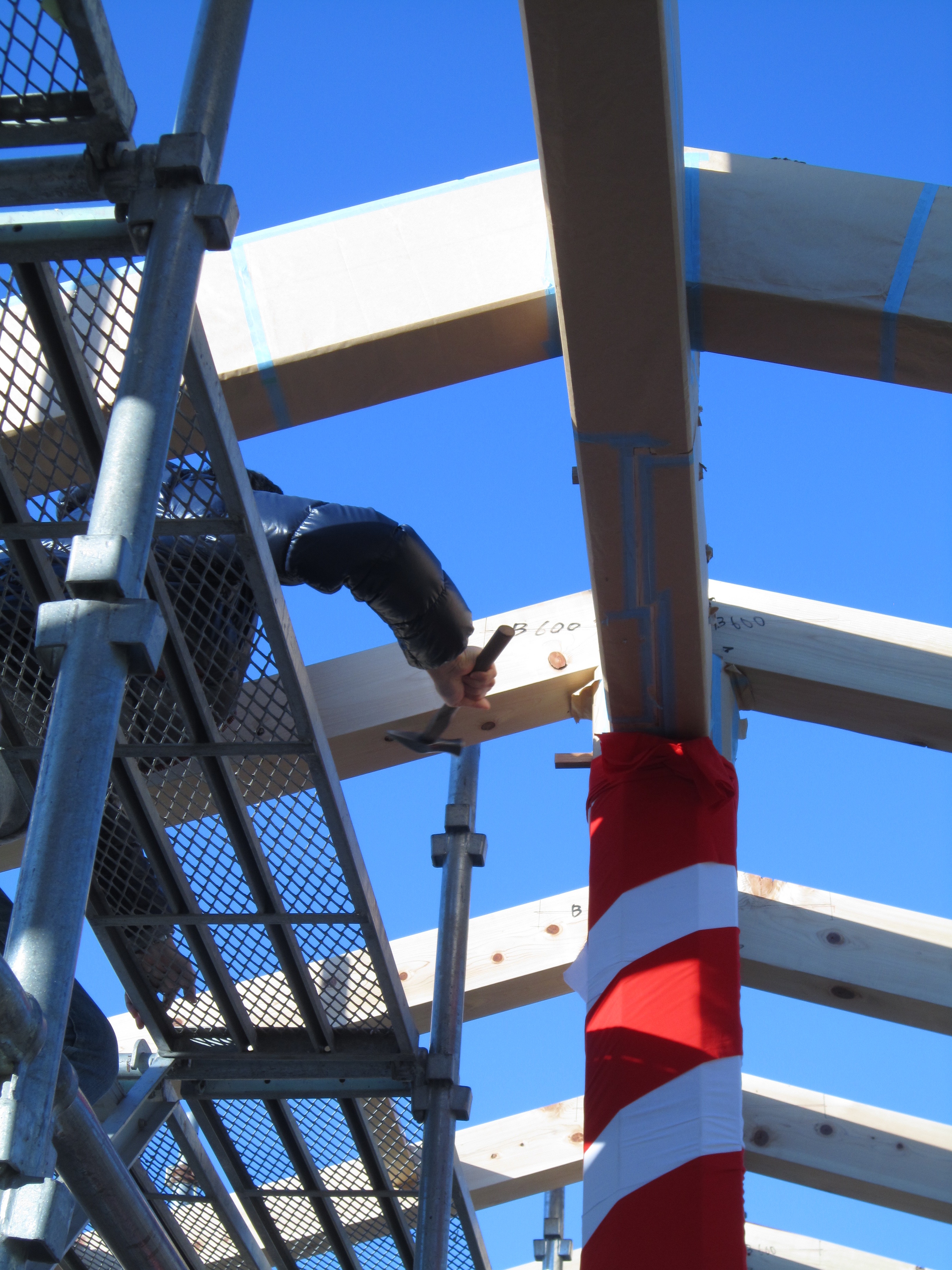 最後に施主さんが、あの柱のてっぺんの「込栓」を打ち込んで