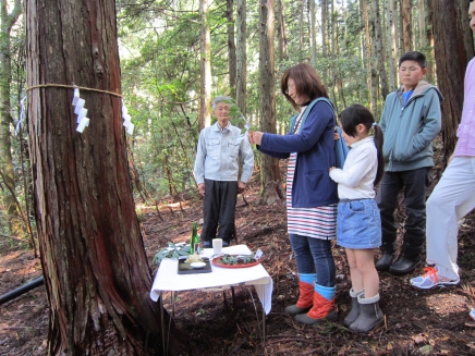 この時期は伐採の時期ではありませんが、林道整備にともなって間伐をするということで、実際の伐採を見せてもらうこともできました。