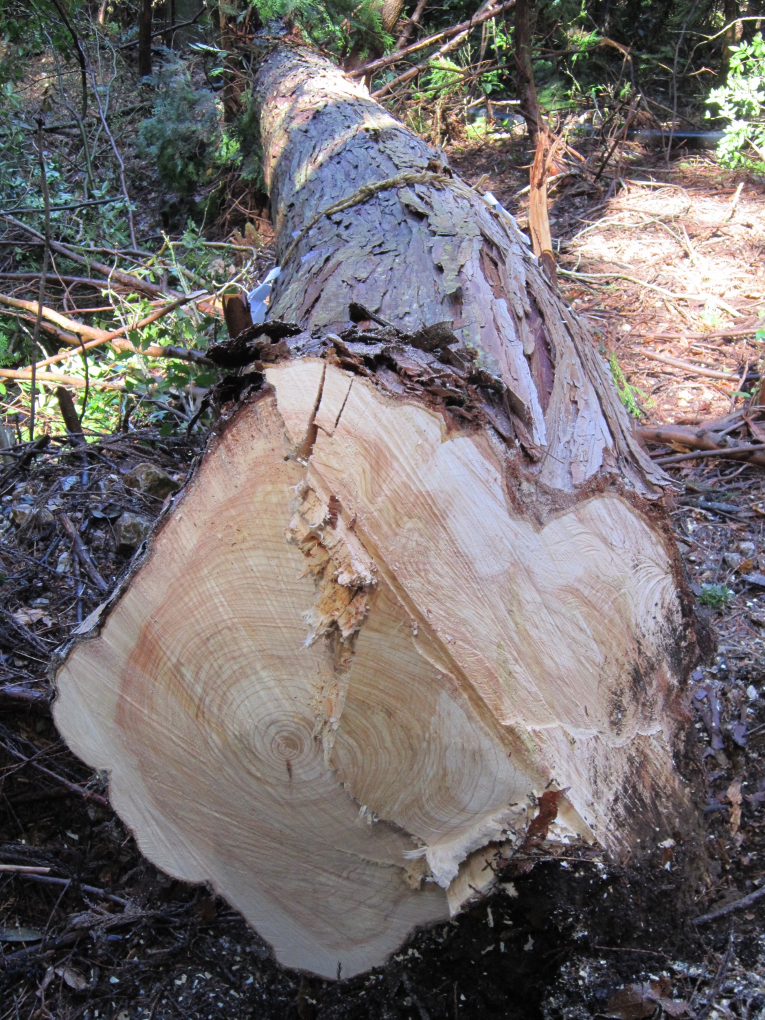 この年輪を見ると、30年生くらいの頃に、一度周りが間伐されたことがわかります。