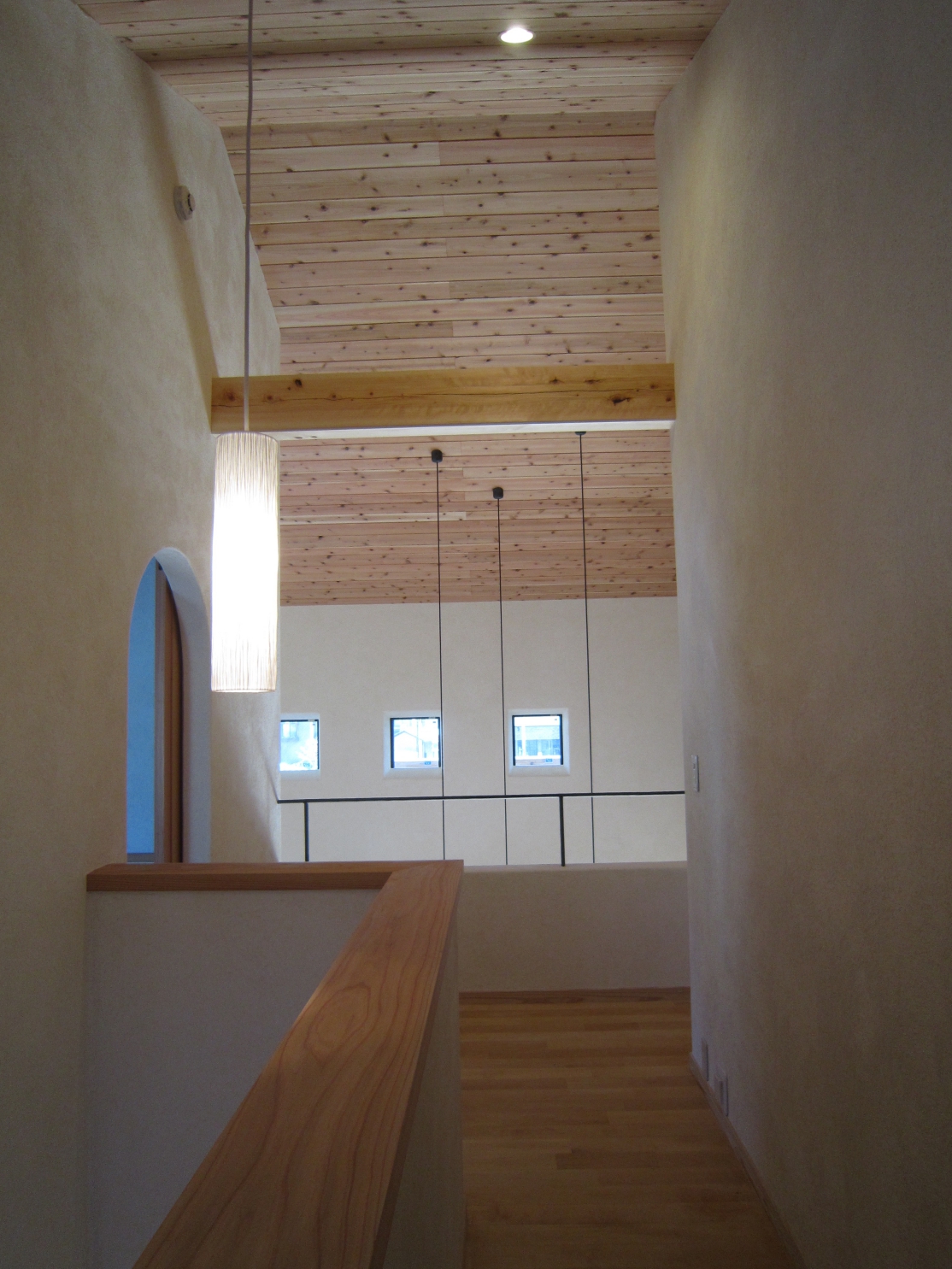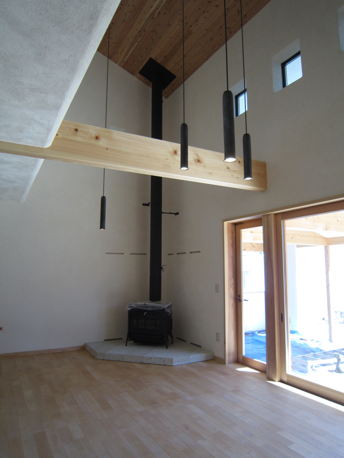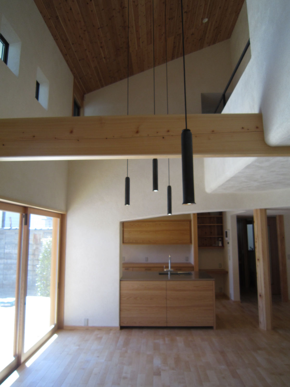 屋根がなく、登り梁が見えているのは、消防からの指導でスプリンクラーの放水がゆきわたるようにです。