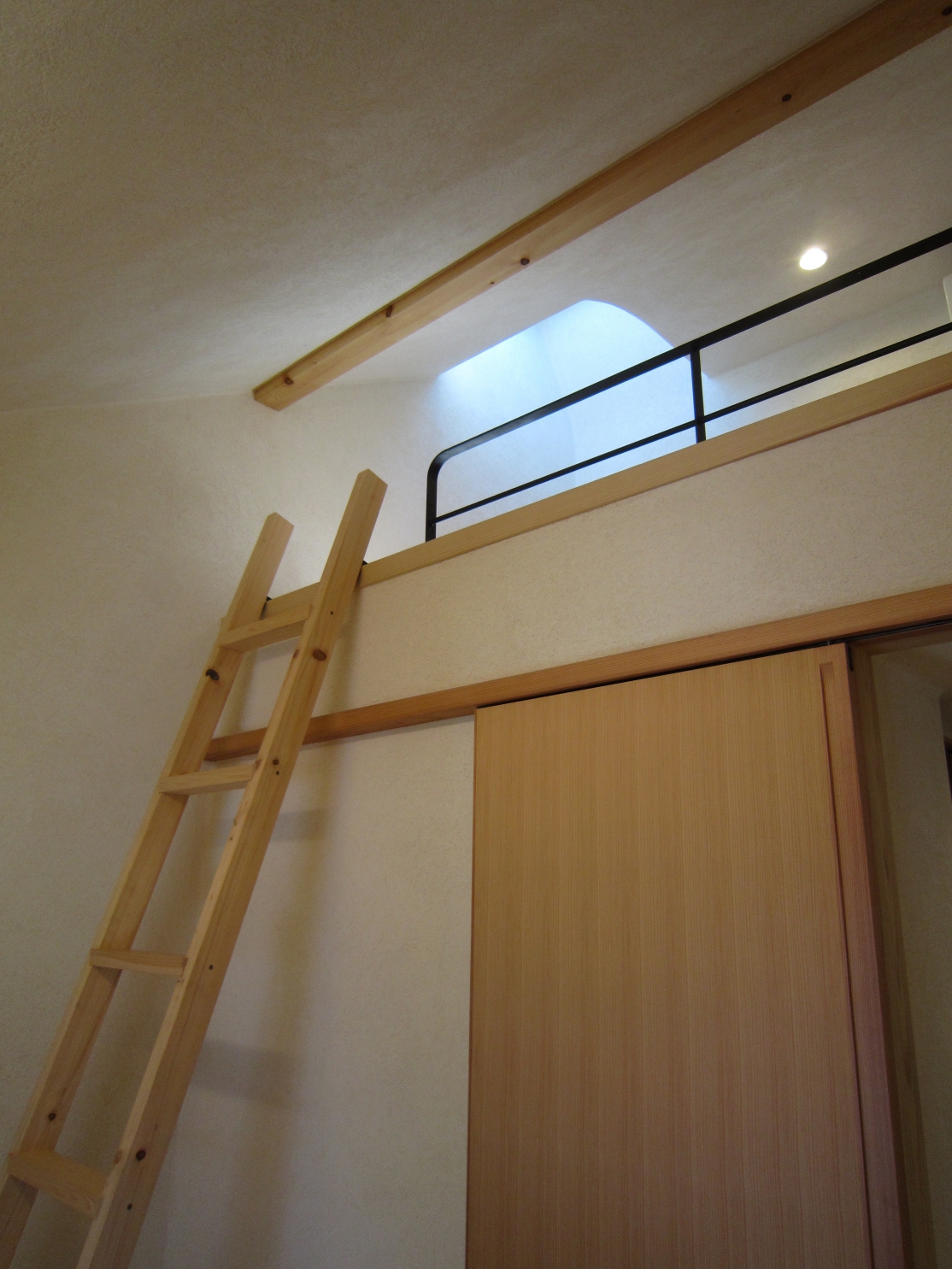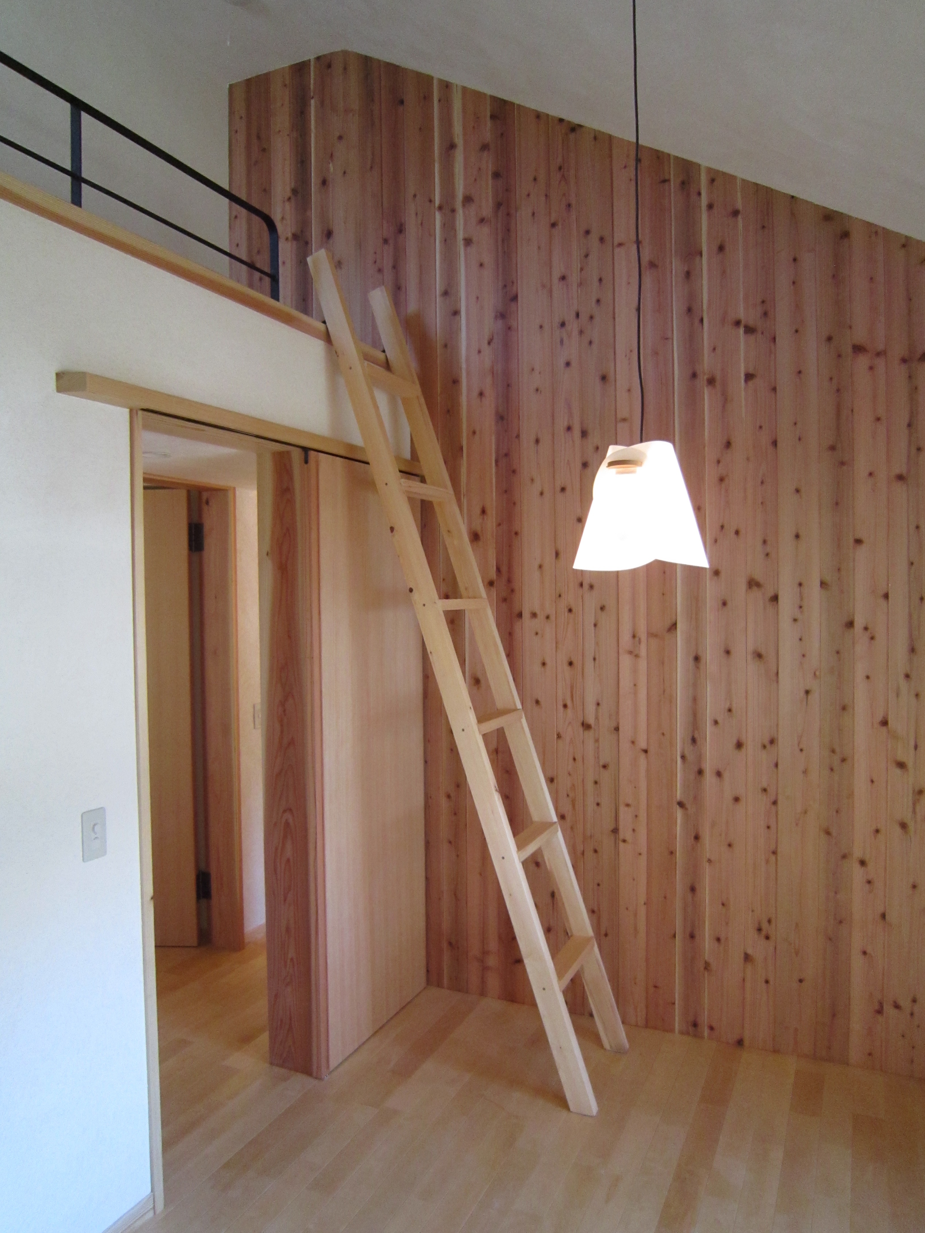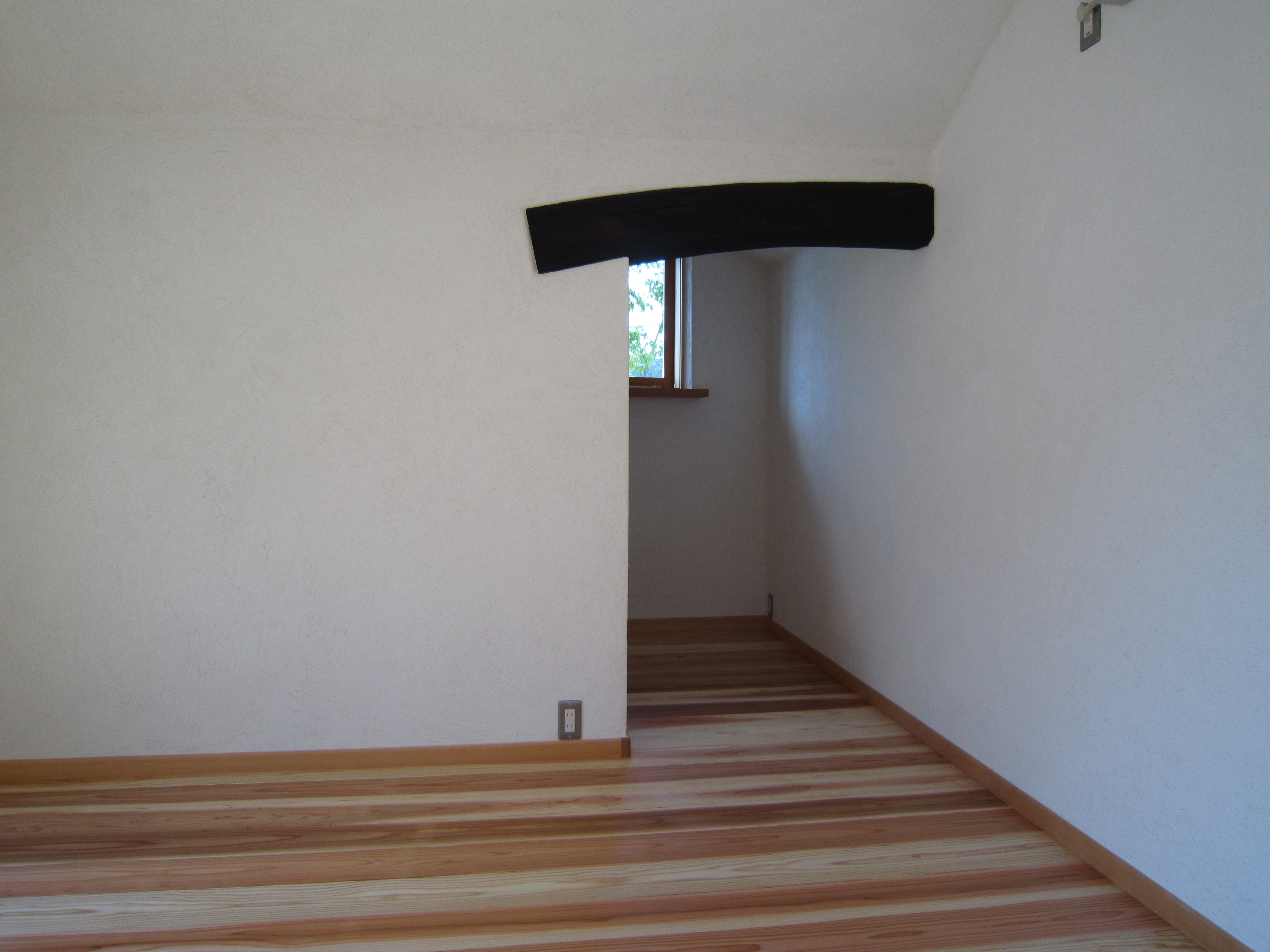 2階寝室。左の板の扉は小屋裏物置。施主さんがどこかに使いたいと言っていた把手を付けました。