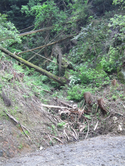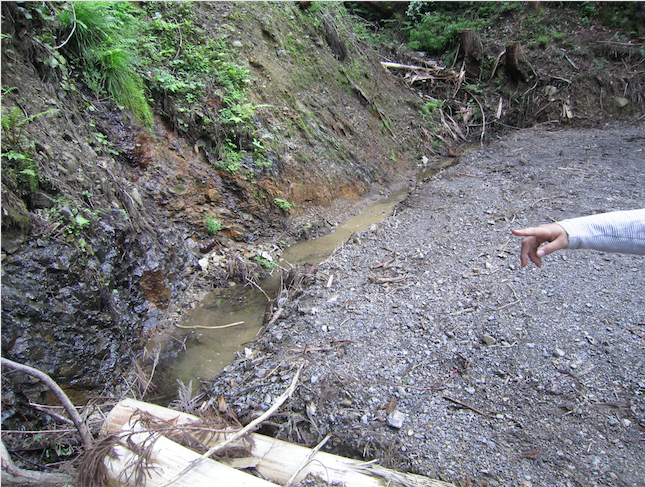 そうすると、左の写真のように雨が降った時に水が流れる谷筋を切るような場所が出てきます。