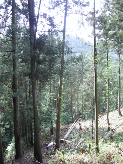 左の写真、奥の部分は間伐の済んだ森。右の写真は間伐されていない未整備の森。