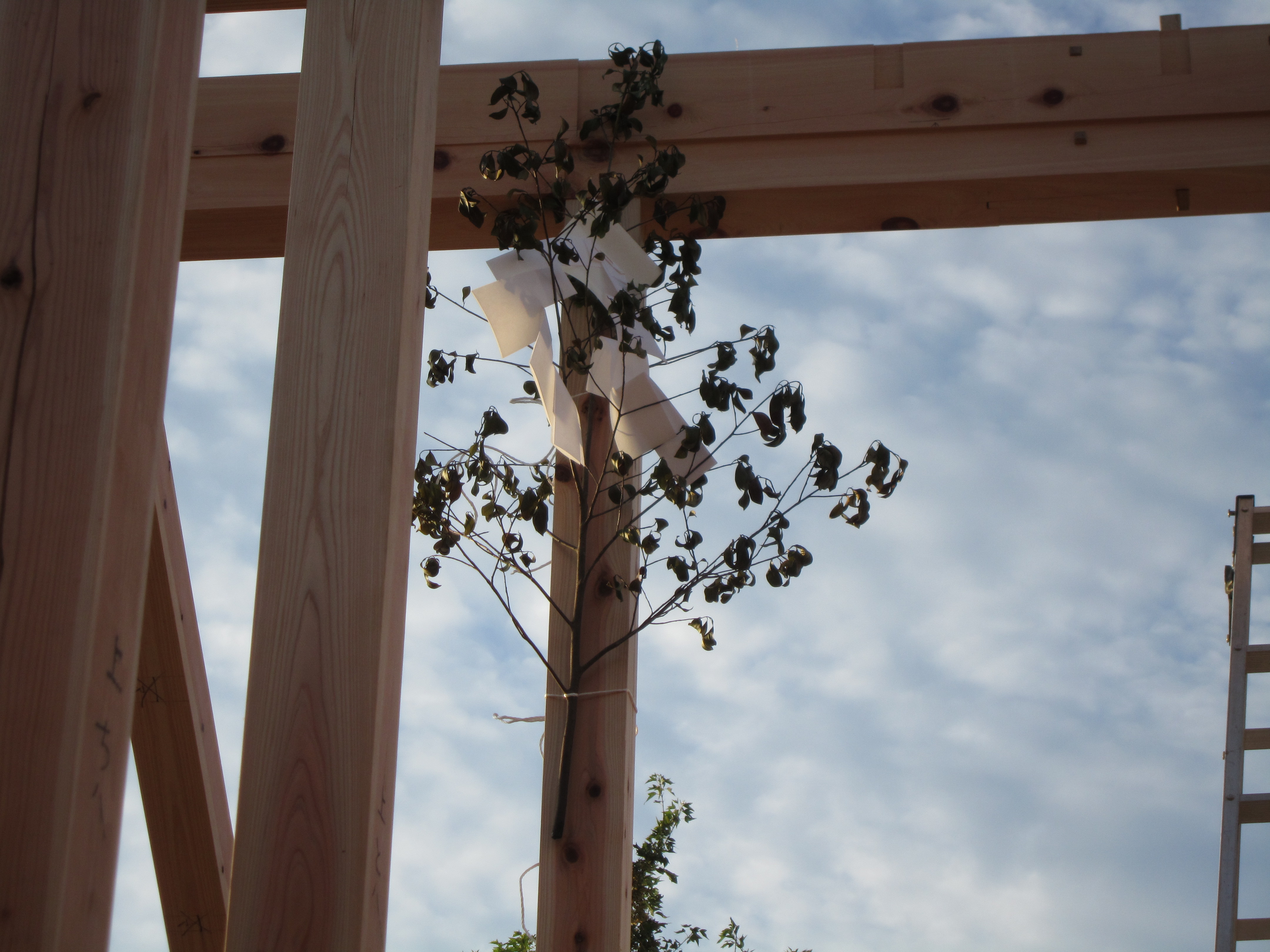 どうにかその日のうちに棟木までは上がり、榊と棟札を飾り付けました。