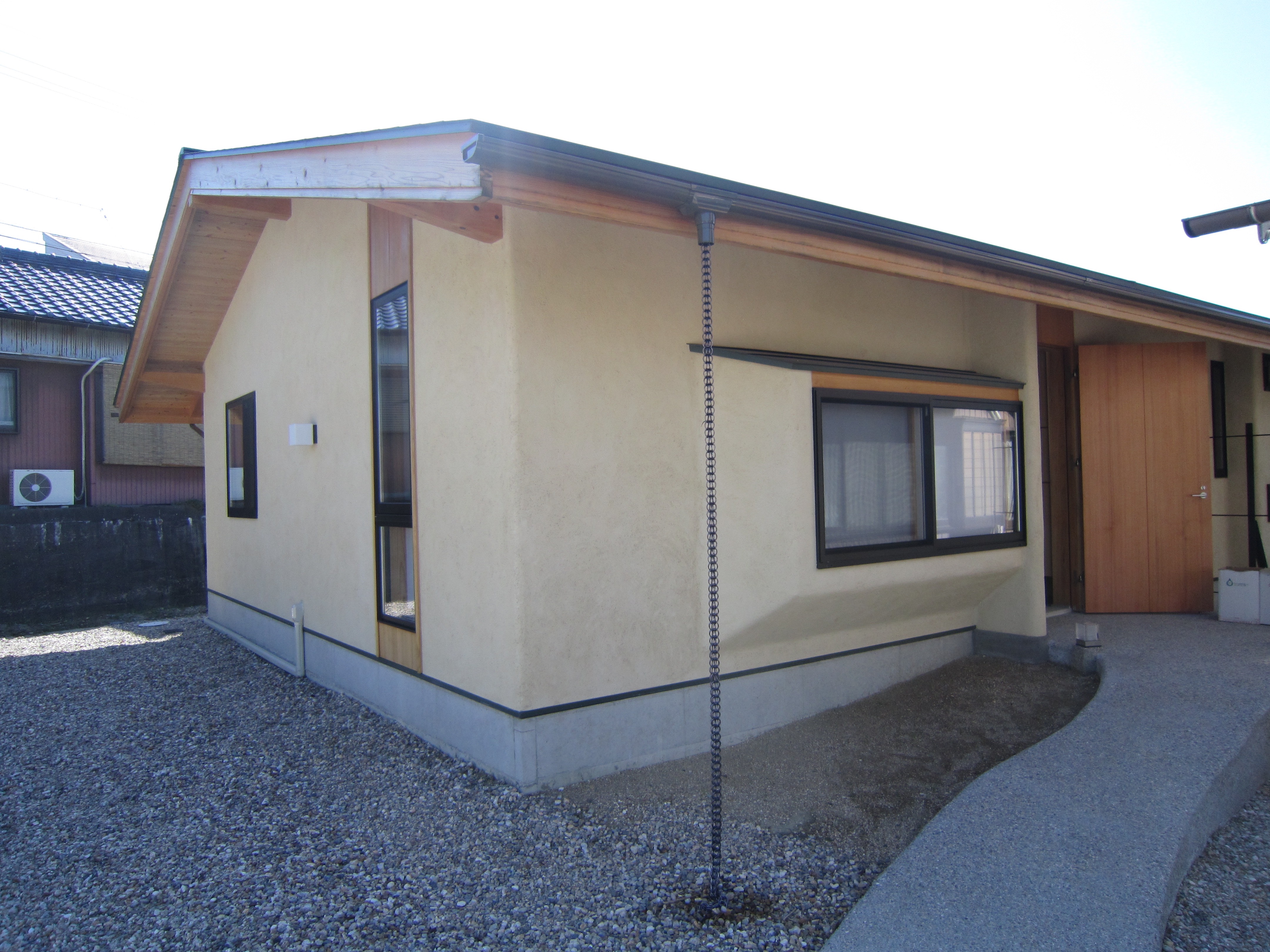 この下に通気胴縁があり、さらにその内側に透湿防水紙があって壁体内の湿気を抜く仕掛けになっています。